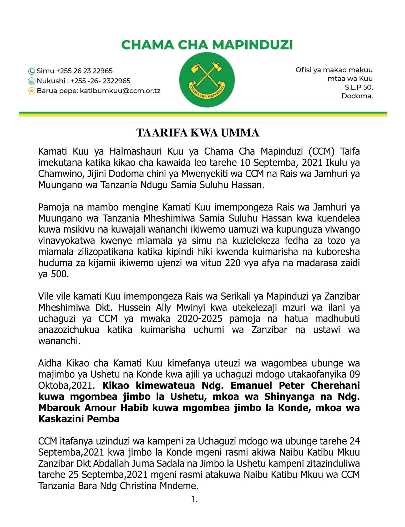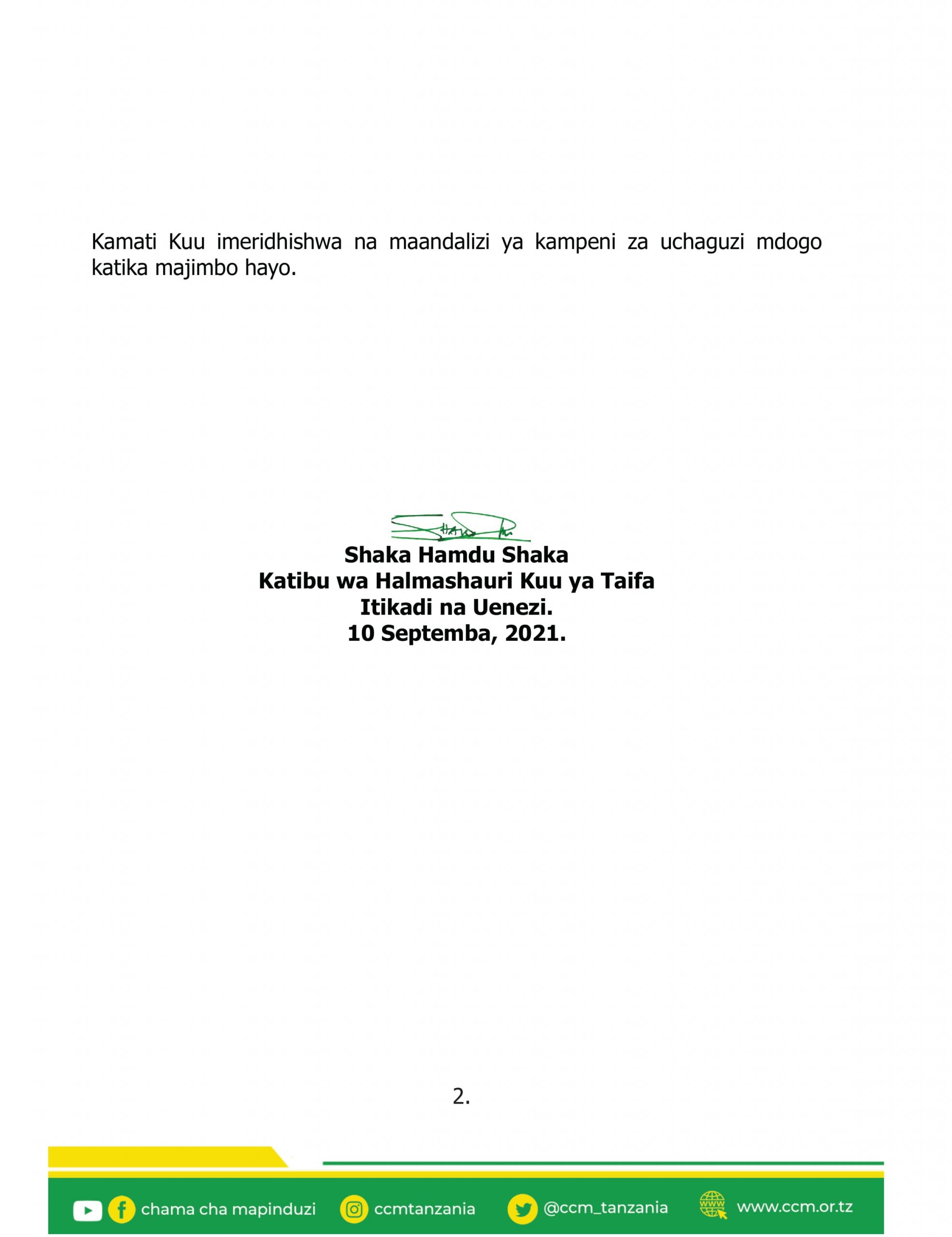 Mwenyekiti wa Chama cha Mapinduzi CCM na Rais wa Jamhuri ya Muungano wa Tanzania Mhe. Samia Suluhu Hassan, akiongoza kikao cha Kamati Kuu ya Halmashauri Kuu ya Taifa ya CCM kilichokutana leo Sept,10,2021 Ikulu Chamwino Jijini Dodoma.