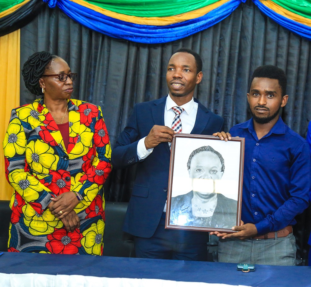 Naibu Waziri Ofisi ya Waziri Mkuu - Kazi, Vijana, Ajira na Wenye Ulemavu Mhe. Patrobas Katambi (wa pili kutoka kushoto) akikabidhiwa zawadi ya picha iliyochorwa ya Waziri wa Nchi Ofisi ya Waziri Mkuu - Kazi, Vijana, Ajira na Wenye Ulemavu Mhe. Prof. Joyce Ndalichako na mwanafunzi wa Chuo Kikuu cha Afya na Sayansi Shirikishi Muhimbili (MUHAS). Kushoto ni Mlezi wa Chuo hicho, Bi. Stella Jackson. Kulia ni Mwenyekiti wa Taasisi ya Mzalendo Project Foundation (MZPF), Bw. Enock Mwesiga.